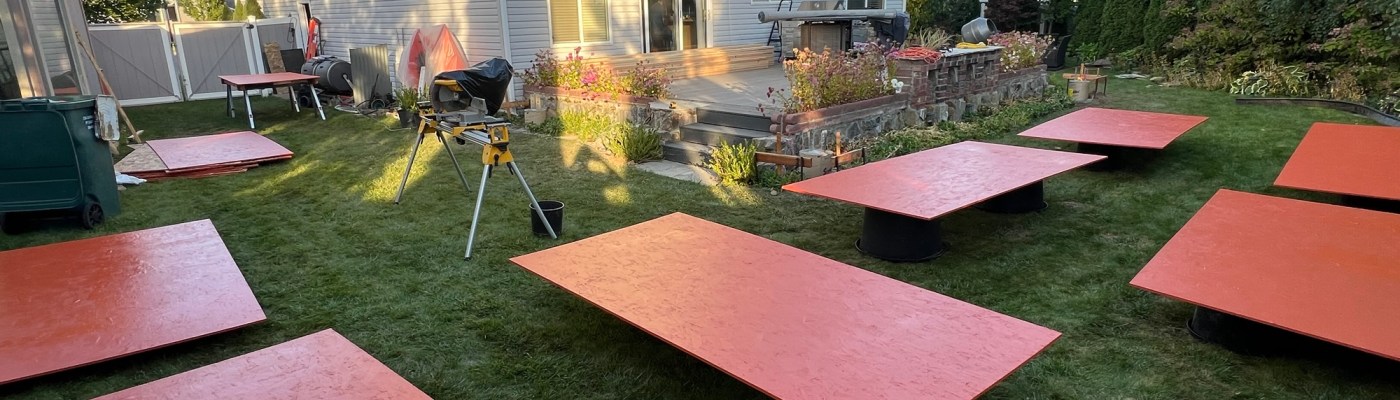 While waiting for the concrete to cure, we started cutting the pieces of wood we needed for the various parts, including the posts. We also started talking about a color story we wanted for the patio. We landed on grey and orange as the primary colors, with the posts and trusts in a dark grey, the supports in a light grey stain, and the roof in international orange. We thought the orange would help keep the area light and feel more open on cloudy days.