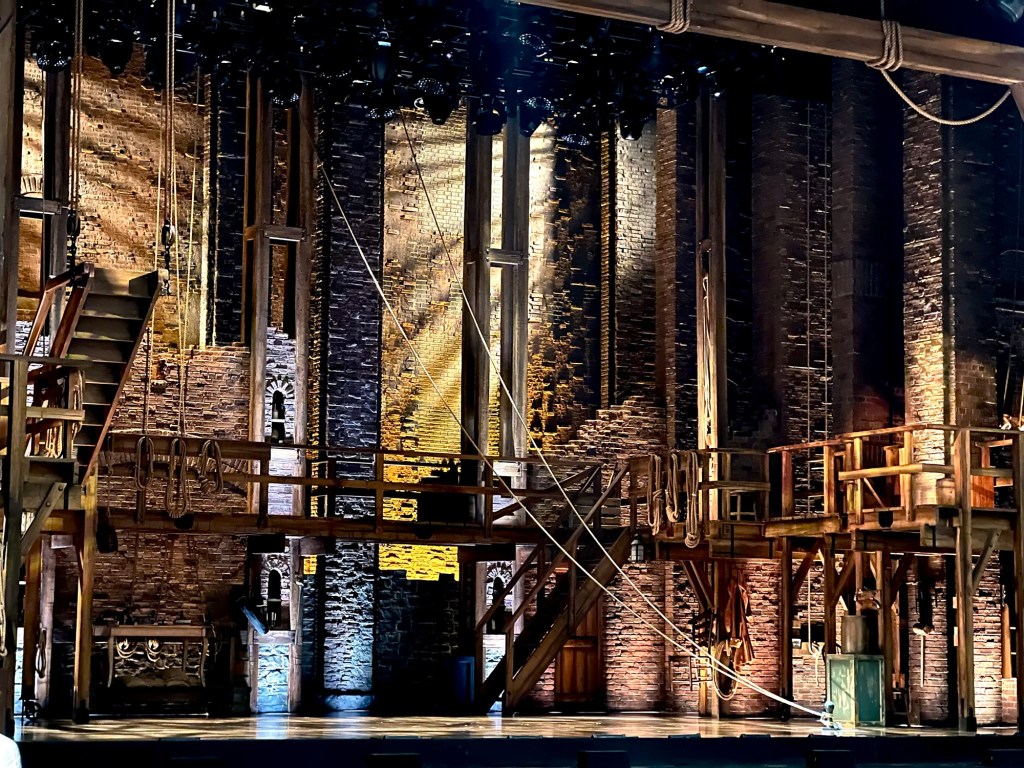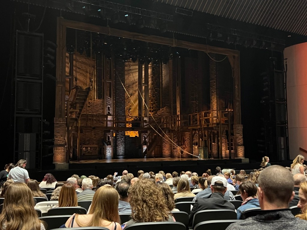 We have watched the show countless times on Disney+, listened to the soundtrack on car rides, and watched the show live in 2022. During our shift, we could hear and see the show as it was live-streamed in the lobby. Certain parts of the show sounded different to us; honestly, we were unsure if we would like this version. Thursday came, and we headed downtown like the other five shifts, parked in our usual spot, and picked up our tickets from Will Call. As we walked away, I looked inside to find two orchestra seats in the thirteenth row. We laughed because we had just bought tickets for the Michael Jackson Musical and thought that orchestra seats would be too close to enjoy the show, but we said this could be fun because our 2022 Hamilton tickets were on the terrace level.