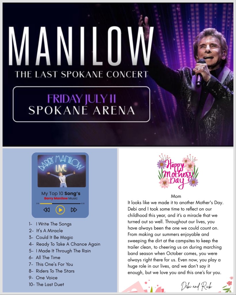 Last week, I saw that Barry Manilow was heading to Spokane for a one-night concert, his last in Spokane. I called Deb and asked if she wanted to get tickets for the three of us to see him as a Mother’s Day gift for Mom; she was all in. The last time we saw him live would have been in 1985 when he performed at the Concord Pavilion and used our high school choir as a backup for the song One Voice. As a little kid, Mom would always play his records, so listening to him always brings me back. I have heard his music off and on for well over forty-five years now, and to see him live one last time will be so special for all of us.
