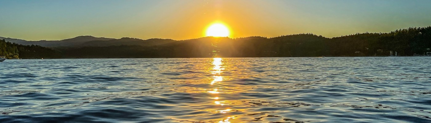 It was a perfect night for a ride; there was not much wind, and the water temperature felt great. We started at Highins Point and traveled across the lake to head towards the resort. The setting sun made it a challenge, as we forgot our sunglasses, but we made it work. We decided to travel down the Spokane River briefly before returning. As the sun set, most boats had already cleared the lake, so we had plenty of room to glide across the lake.